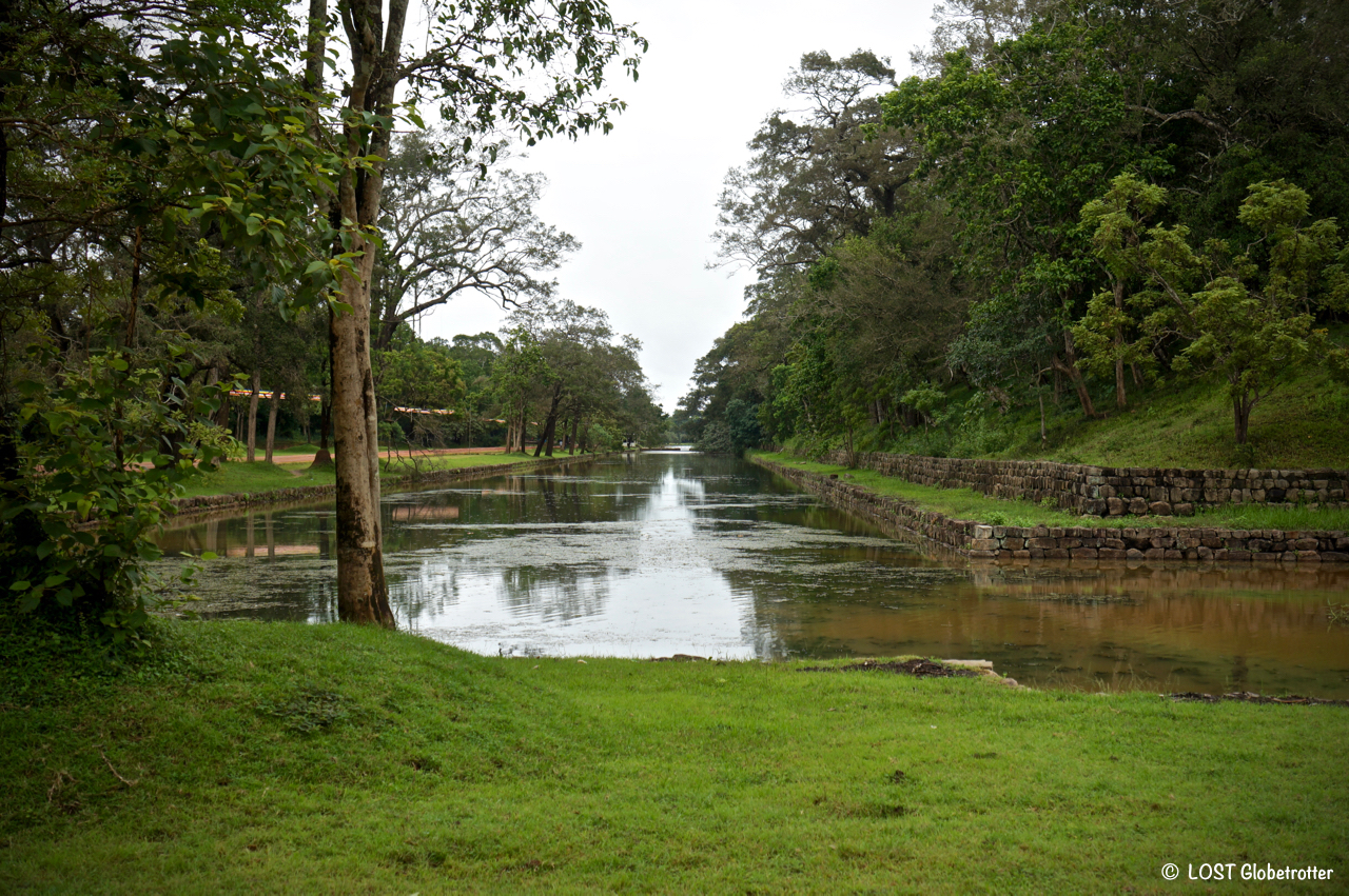 V areálu spodní Sigiriye se nachází královské zahrady rozdělené do tří částí a samotná Lví skála potom představuje vyvrcholení celé prohlídky 🙂 . Po překonání vodního příkopu (vlastně jde jen o přejití mostu) se ocitáme na začátku uličky vedoucí prostředkem Vodních zahrad, které jsou plné jezírek, zavlažovacích kanálů, fontán a různě podlouhlých bazénků. Vše je tu dokonale symetricky geometrické a v kombinaci s prapodivně tvarovanou skálou přímo přede mnou je tato cesta dokonalým zážitkem. Čím více se ke skále přibližuji, tím robustnější se mi zdá být. A na samém jejím úpatí mám pocit, že nade mnou roste až do těch dnešních šedivých nebes. Ne nadarmo se komplexu, který údajně stával na vrcholu, říkalo pevnost v oblacích. Nakonec mohu být ráda, že teď už jen občas lehce sprchne a absence přímého slunce a 35ti stupňového vedříčka mi nakonec vůbec nevadí.