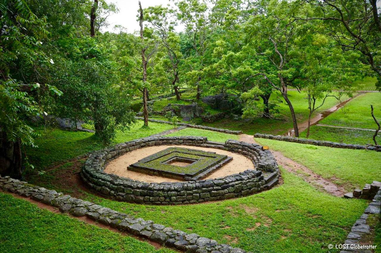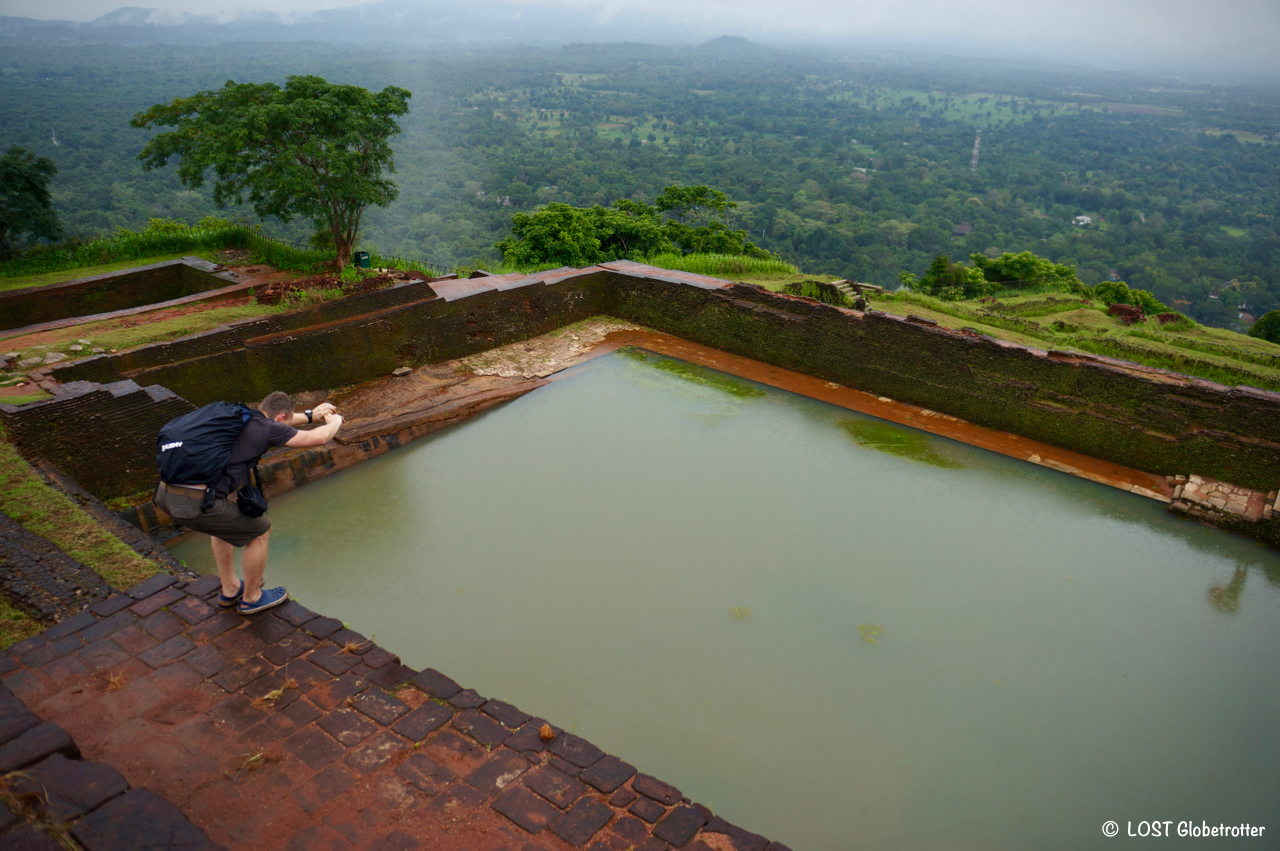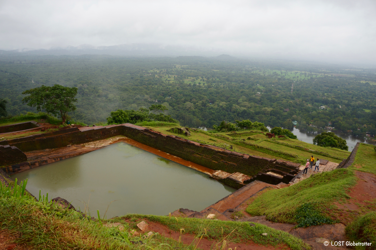 Těžko si lze představit, jak původní stavby skutečně vypadaly. Snad jen díky našim chytrým průvodcům vím, že na nejvyšším bodě skály stál králův palác a trůn, ale teď tu z něj vidím jen obdélnikové cihlové základy. Stejně to měl ten Kassapa dobře vymyšlené, kdo by se nechtěl každé ráno a večer kochat úžasným pohledem na vycházející a zapadající slunce, že ;-). O úroveň níž, na vnější (východní) části paláce, kam se dostaneme po cihlovém chodníčku, se nacházely prostory pro vojáky a služebnictvo. A ještě dále na jižní straně se zřejmě byly umístěny palácové zahrady oddělené od zbytku staveb terasovými hradbami. Pozornosti žádného návštěvníka neunikne ani velikánský bazén vytesaný ve skále, který sloužil jako zásobárna vody pro zdejší obyvatele. Systém byl nejspíš tak dobře propracovaný, že deštová voda se v něm zadržuje i dnes.