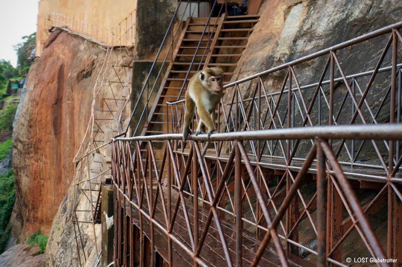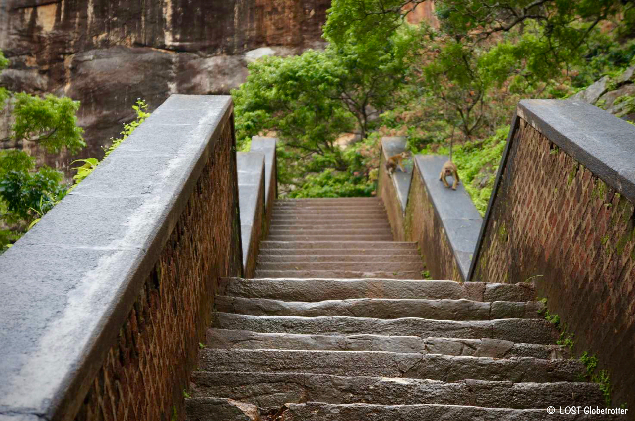 Po návratu na hlavní cestu začínáme stoupat kamennými a cihlovými schody skrz Terasové zahrady táhnoucí se až k základně skály. Tu se prvně setkávám s mým dnešním „WOW“ a to jsou opičky (nejspíš makakové) v divoké přírodě. Vidí nás a jsou v pohodě, ale přijít blíž si netroufají. Chvíli bych je zůstala sledovat, ale čas letí, a tak se uklidňuji, že v příštích 17 dnech na Srí Lance ještě nějakou opici určitě uvidím. Jen co se s J. vyšplháme po schodech na poslední terasu, otevře se před námi nádherný panoramatický výhled na vše, co jsme doteď nechávali za sebou. Dejte mi chvilku, z té krásy mi došla slova…