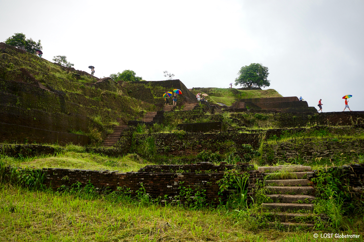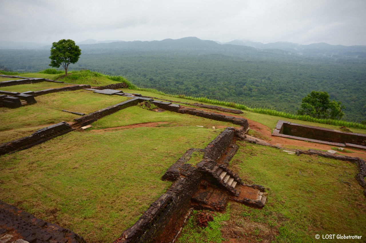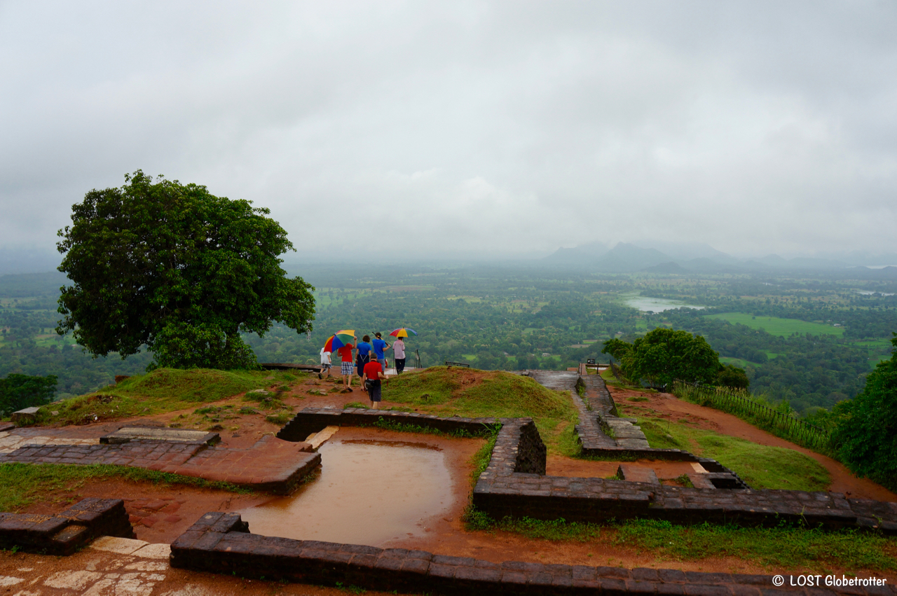 Ve výšce 200 metrů nad zemí pak na nás čeká zasloužená odměna. Kromě dvouhektarové plošiny (což si můžete představit jako rozlohu o půlce pražského Václaváku) pokryté půdorysem někdejších palácových budov, odkud král Kassapa vládl celé Srí Lance, se tu i přes závoj jemného mrholení nemůžeme nabažit úžasných výhledů do okolní krajiny hustých zelených lesů a vodních zahrad pod skálou.